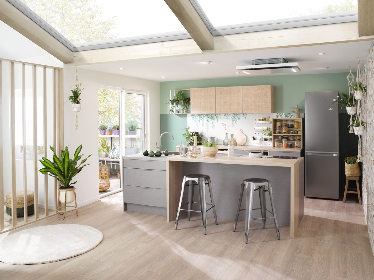 Un îlot central design, qui joue sur les codes du style industriel avec un plan de travail en deux parties mixant deux décors complémentaires : le bois et le béton. Ses lignes géométriques peaufinent le décor minimaliste et soigné de la cuisine.