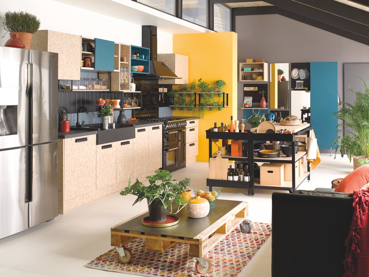 Les meubles hauts en laque moutarde brossée forment un trait d’union évident entre les éléments noirs et la crédence en mosaïque bohème. Pour une déco pleine de goût !