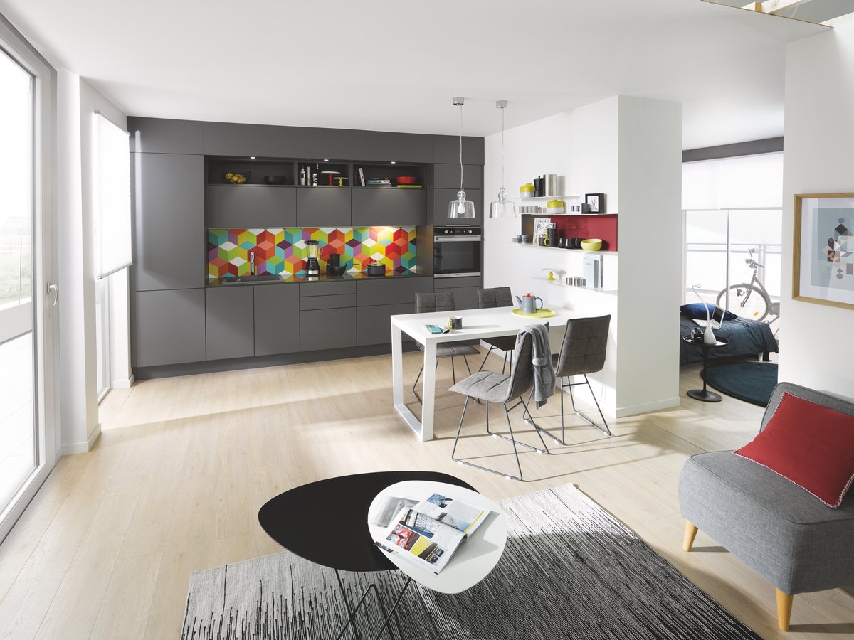 Dans une cuisine étroite, tout le monde veut gagner de la place. Evidemment, on agence le tout pour apporter praticité et beaucoup de modernité, et on colore chaque espace de rangement de pannacotta mat : la cerise sur le gâteau !
