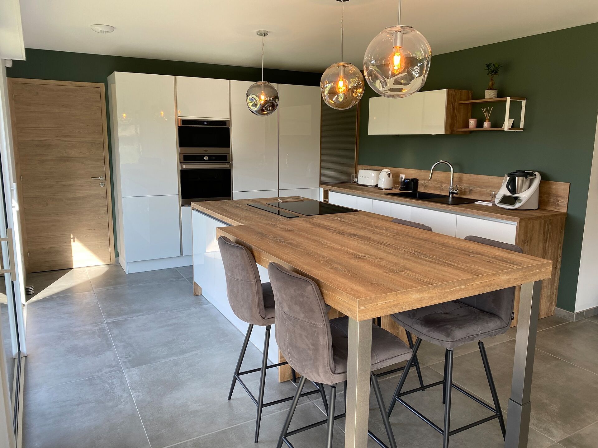 Les façades blanches des meubles hauts et bas de cette cuisine viennent illuminer des murs verts et un plan de travail en bois afin de souligner une ambiance pleine d’une vitalité toute naturelle. Les poignées métalliques des meubles apportent une note de modernité à la pièce. C’est assurément une cuisine où on se sent bien, et où on a envie de cuisiner ! Le plan de travail arrondi se rabat pour agrandir le passage, ou se relève pour créer un petit coin repas pratique au quotidien. Voilà un intérieur plein de douceur qui respire le printemps !