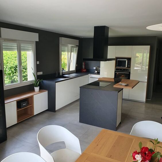 Dans cette cuisine design, tout entre en résonance : les façades d’un blanc uni et lisse avec le plan de travail, la hotte et le mur en noir, la partie décalée en bois de l’îlot avec l’effet pierre du plan de travail… La pièce est ainsi aménagée de manière très épurée. Le choix restreint des couleurs met en avant une ambiance moderne, soulignée par une cuisine sans poignées et l’aspect déconstruit de l’îlot central.