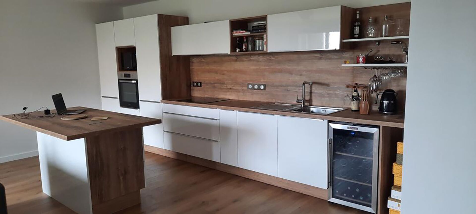 Le mariage du bois et du blanc est une des tendances déco à adopter d’urgence pour créer une atmosphère légère et lumineuse dans les cuisines. Avec sa haute crédence en bois qui fait écho au plan de travail du linéaire et de l’îlot, cette cuisine s’oriente résolument vers un design nature que les façades d’un blanc lisse et uni viennent moderniser. La présence d’une cave à vin intégrée et les longues poignées de meubles métalliques s’inscrivent dans le même esprit.