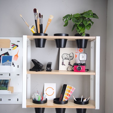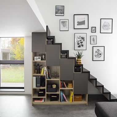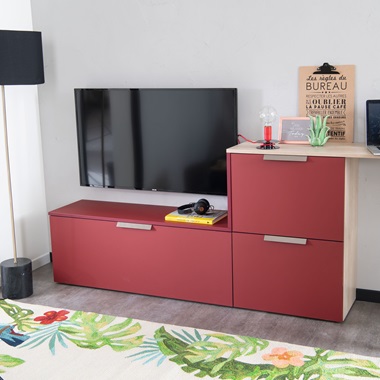 Le salon design Pearl Rouge Cherry et Gris alpaga regorge d’astuces gain de place. Le rangement Darwin et Gris alpaga est aménagé sur mesure sous l’escalier, alternant niches ouvertes et fermées. 2 en 1, le meuble TV / bureau se veut fonctionnel à souhait. Tiroirs coulissants et niches ouvertes permettent d’optimiser le rangement. Pour parfaire l’organisation du bureau, une étagère verte accueille plantes et fournitures de bureau. La crédence établi, accessoirisée avec des crochets, aimants, étagères et boites permet de ne plus avoir d’objets qui trainent sur le bureau, et profiter ainsi de l’espace de travail disponible.