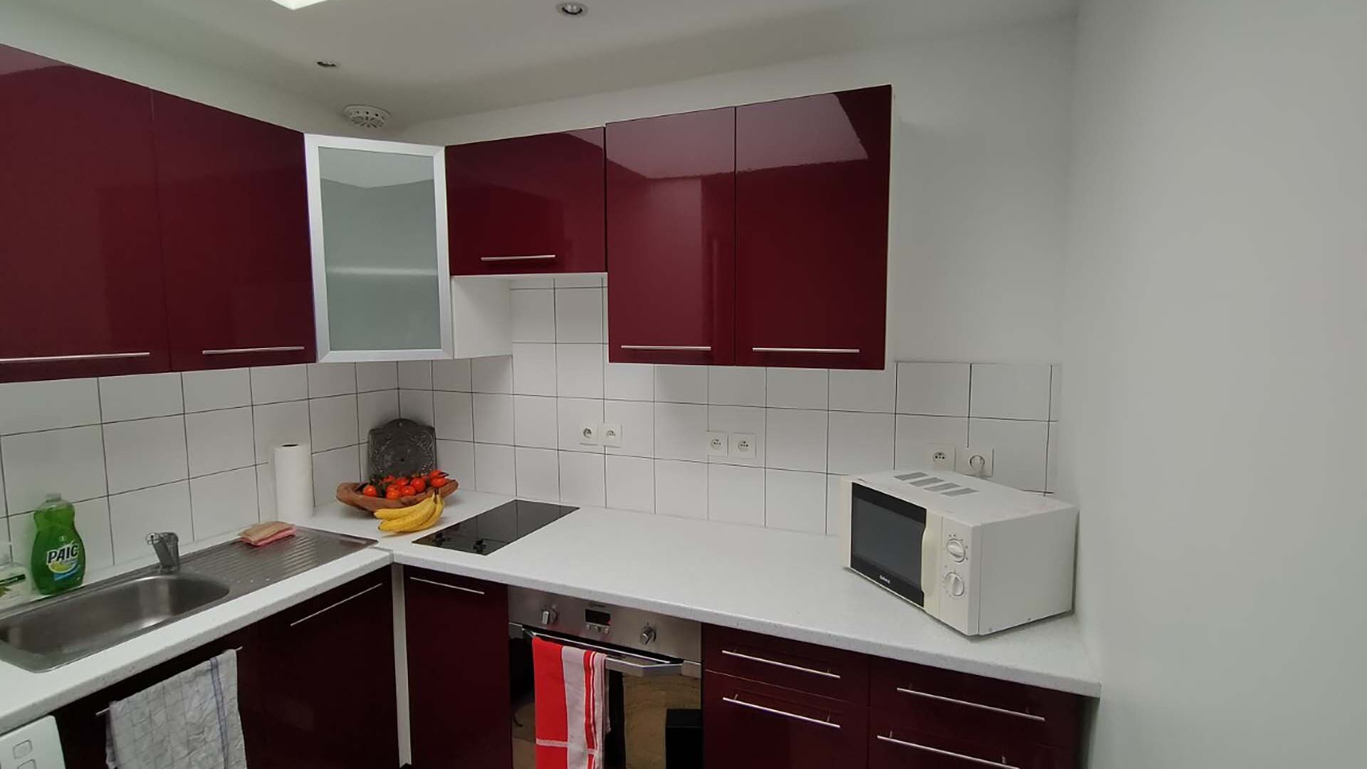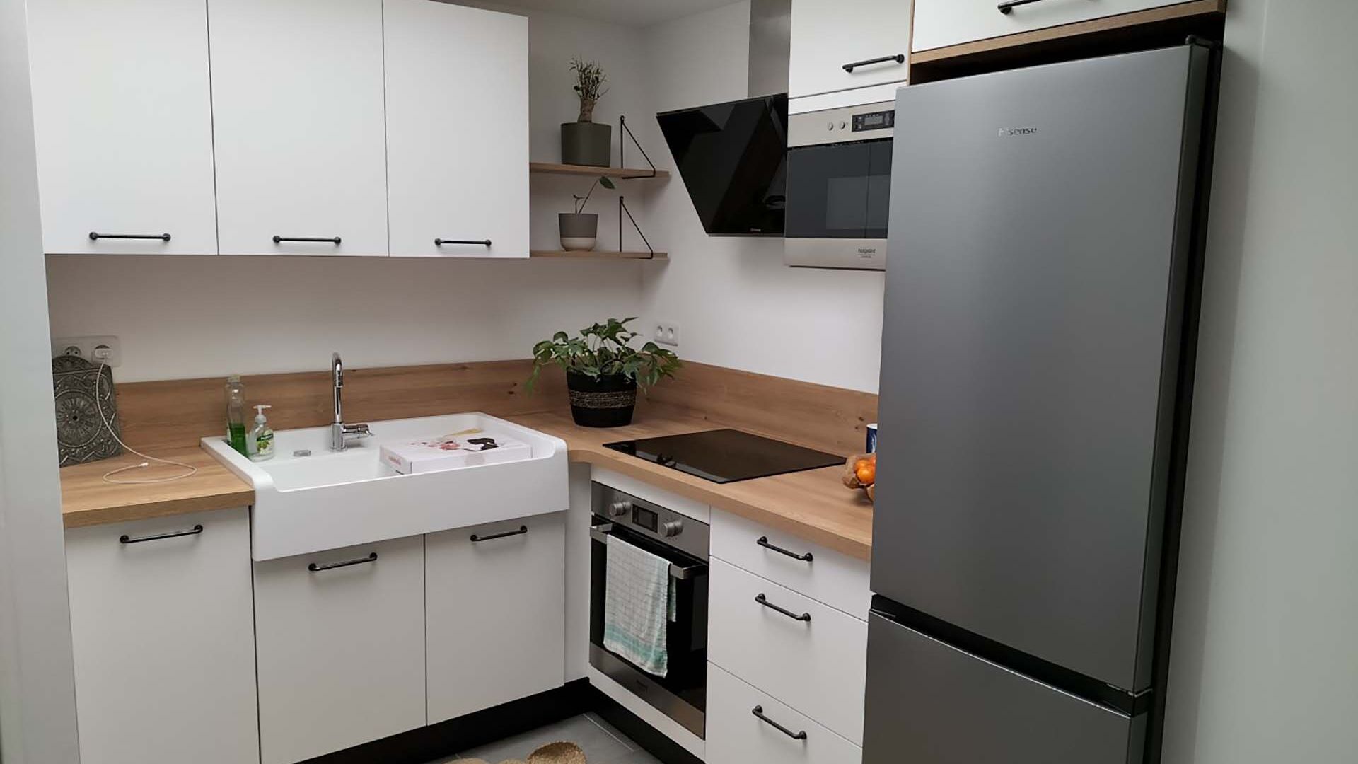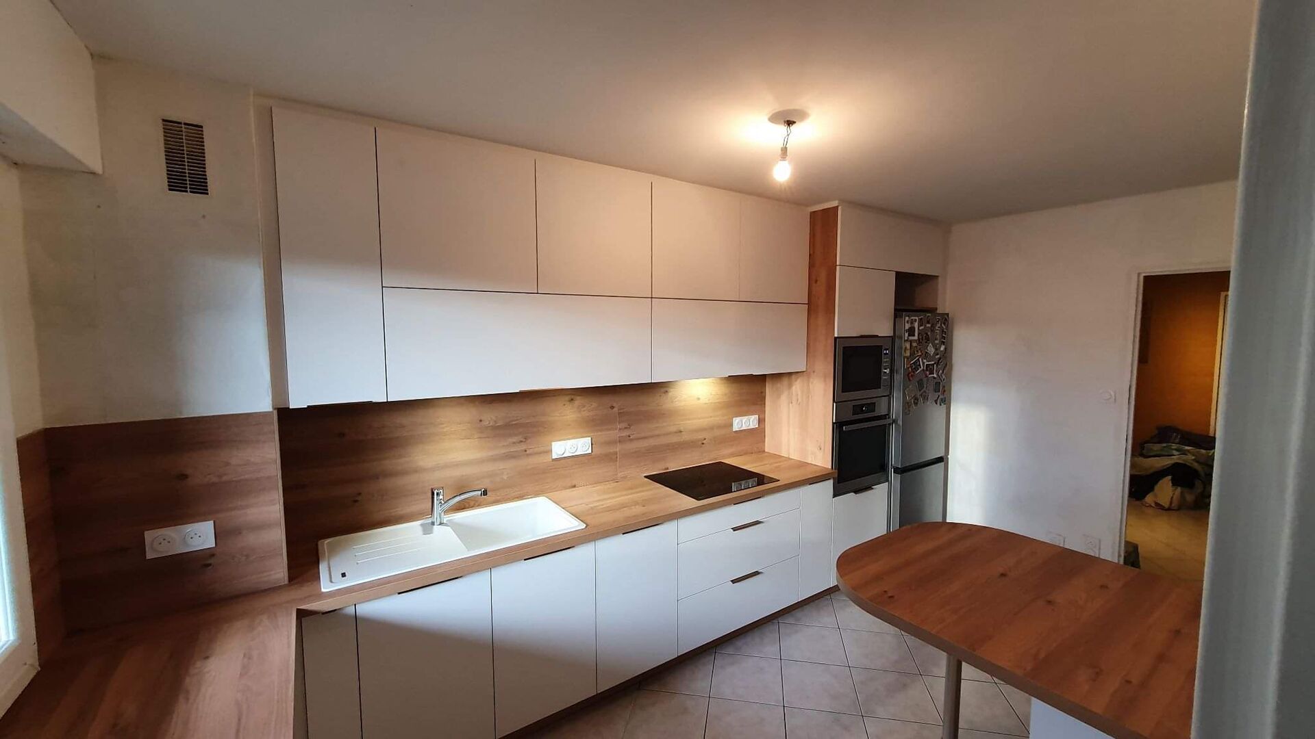 Le blanc est le secret des petites cuisines ! Il n’a pas son pareil pour agrandir l’espace et donner l’impression d’une pièce qui respire, même lorsque les dimensions sont modestes. C’est le choix qu’a fait notre client qui a éliminé le rouge de ses anciennes façades pour opter pour un duo blanc et bois très tendance. Ses petites étagères garnies de plantes permettent d’aérer l’espace tandis que l’évier avec face visible crée une rupture dans le plan de travail qui vient dynamiser l’agencement. La sobriété est de mise dans cette petite pièce : exit la crédence à carreaux, place à un élégant modèle en bois, plus uni et plus élégant.