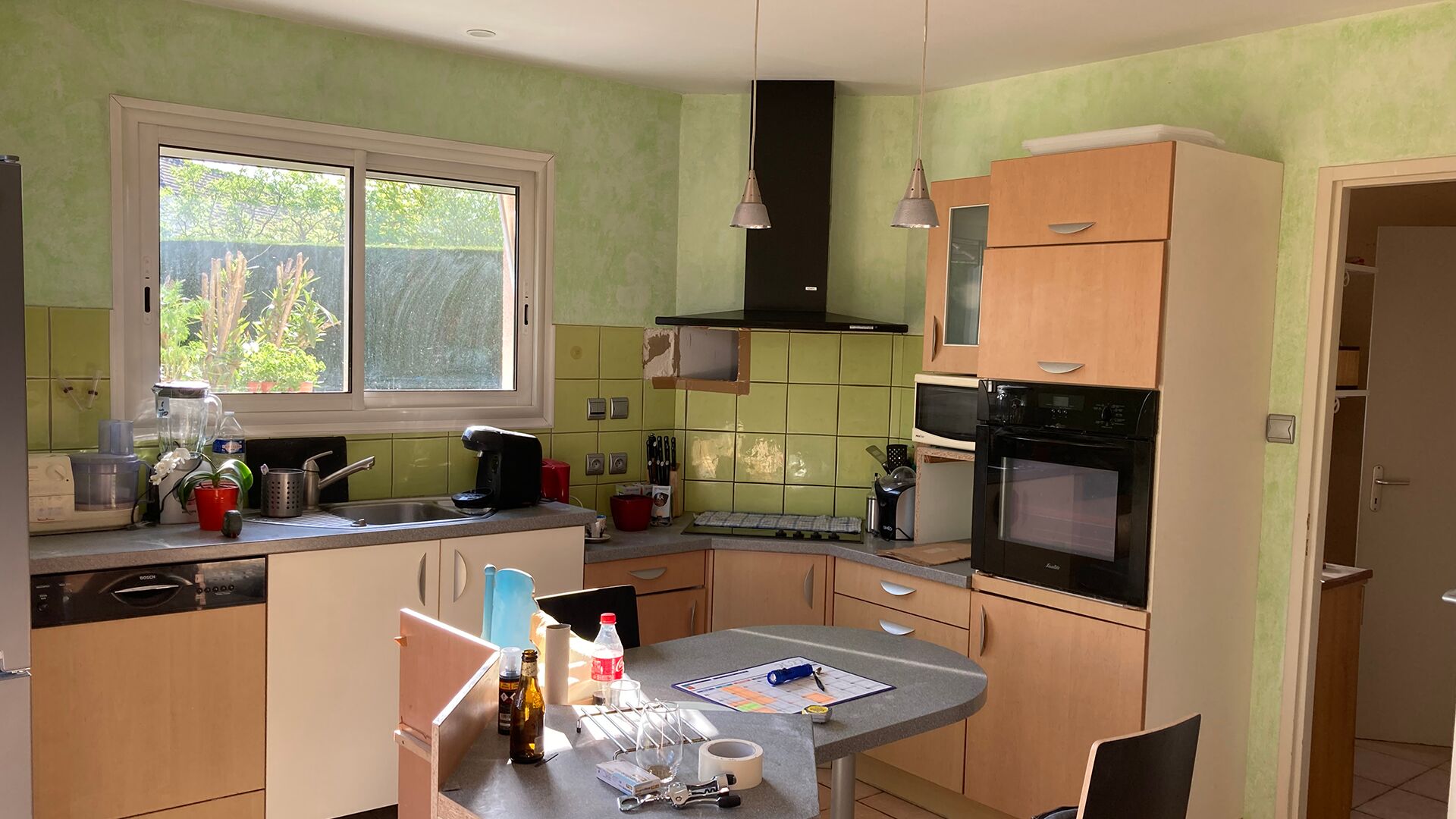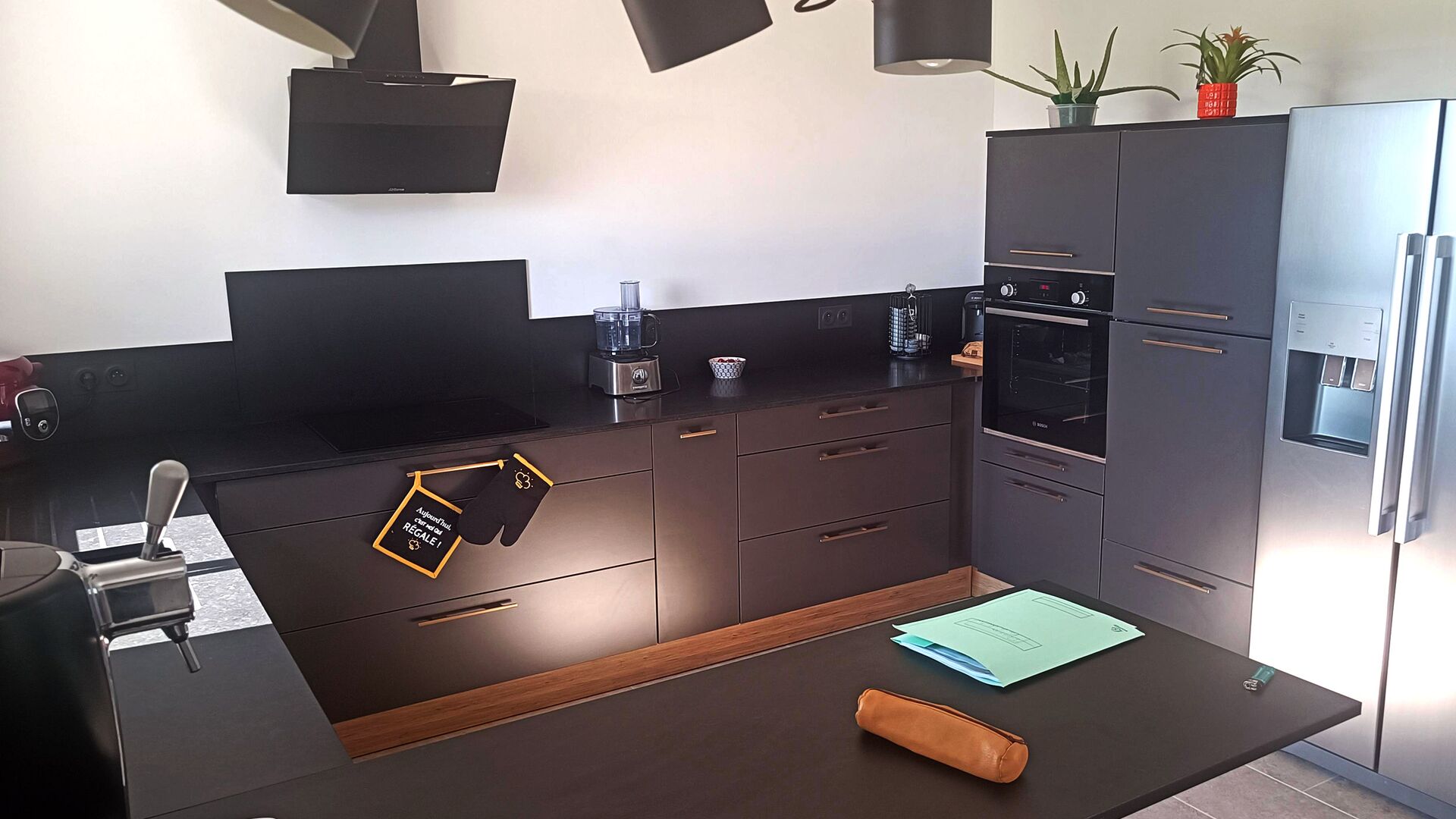 Conçue sur mesure, cette cuisine a fait table rase des meubles blancs et de la haute crédence aux carreaux carrés pour laisser place à des meubles et un équipement noirs aux lignes anguleuses modernes. En résulte un espace épuré et harmonieux, où les longues poignées dorées viennent souligner les lignes structurantes du projet tout en apportant une note chic à la pièce. Le design a été travaillé jusque dans les détails : le luminaire, la hotte, la plaque de cuisson... Tout s’intègre avec une discrétion toute contemporaine à l’esprit d’ensemble. Après travaux, la cuisine bénéficie d’une véritable seconde vie et devient l’une des pièces les plus modernes de la maison.