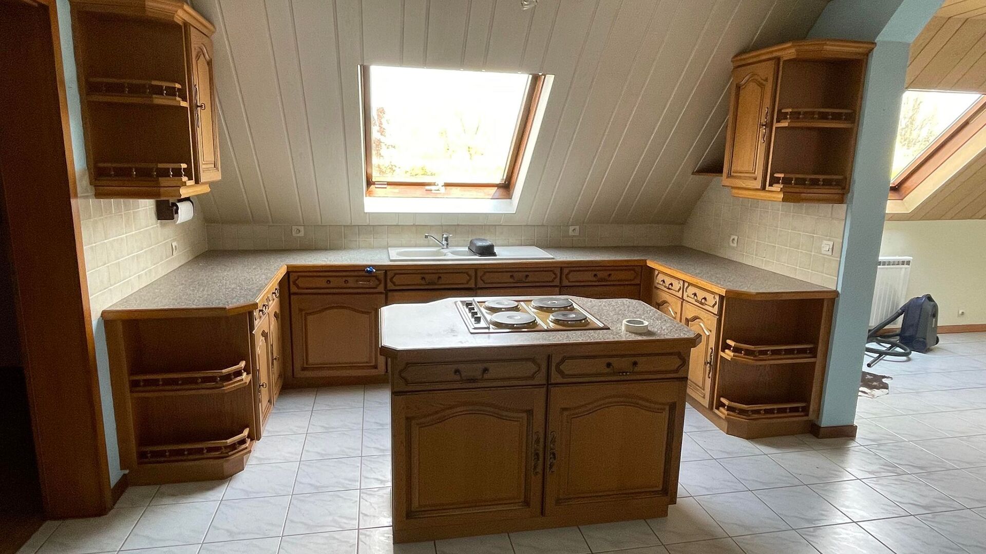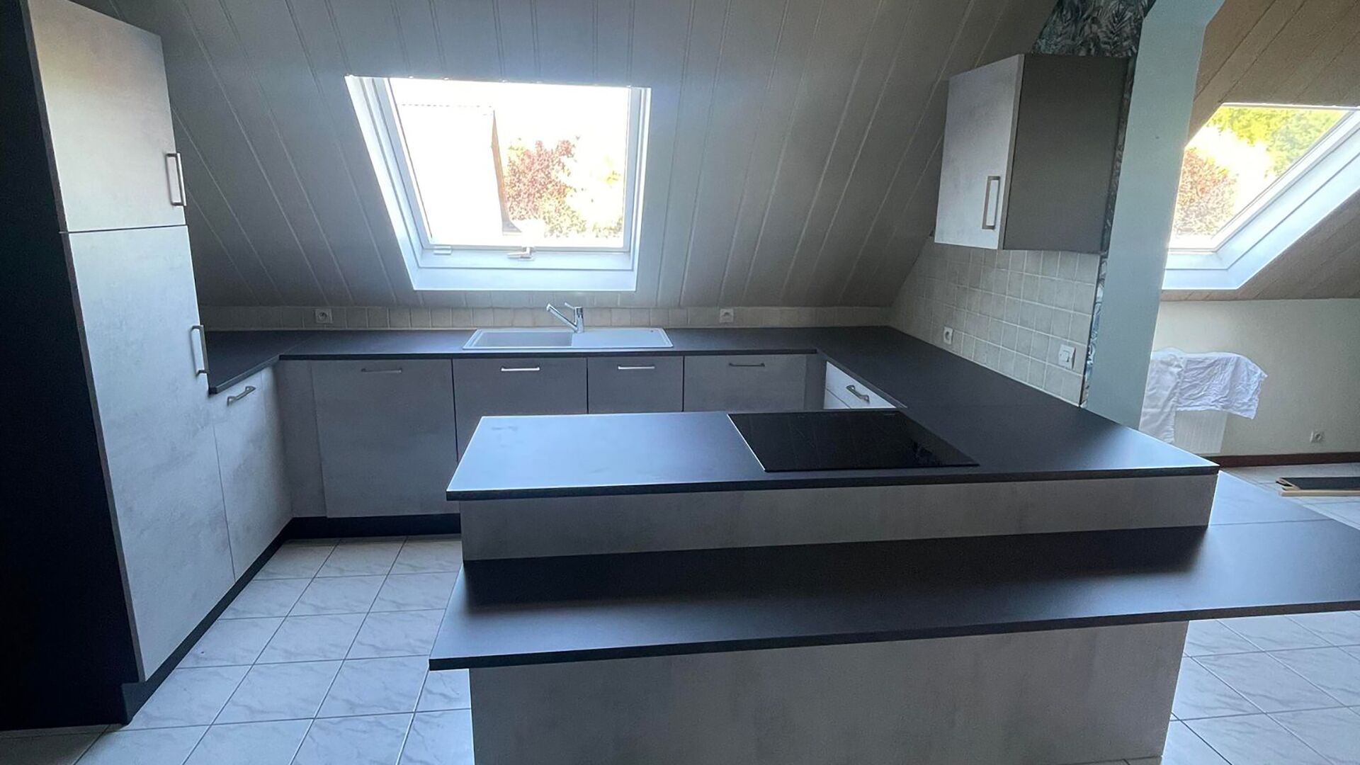 Pour la rénovation de sa cuisine, Christa a remplacé les meubles en bois moulurés par des caissons aux façades lisses tout en repensant l’implantation même de sa cuisine. L’îlot central a ainsi disparu au profit d’une cuisine à quatre côtés, qui bénéficie en outre d’un deuxième plan de travail pour accueillir les repas. L’espace sous les combles est ainsi optimisé et rendu plus moderne par le choix de tons neutres : façades grises et plan de travail noir se marient très bien avec le carrelage existant et avec le lambris en place au plafond.