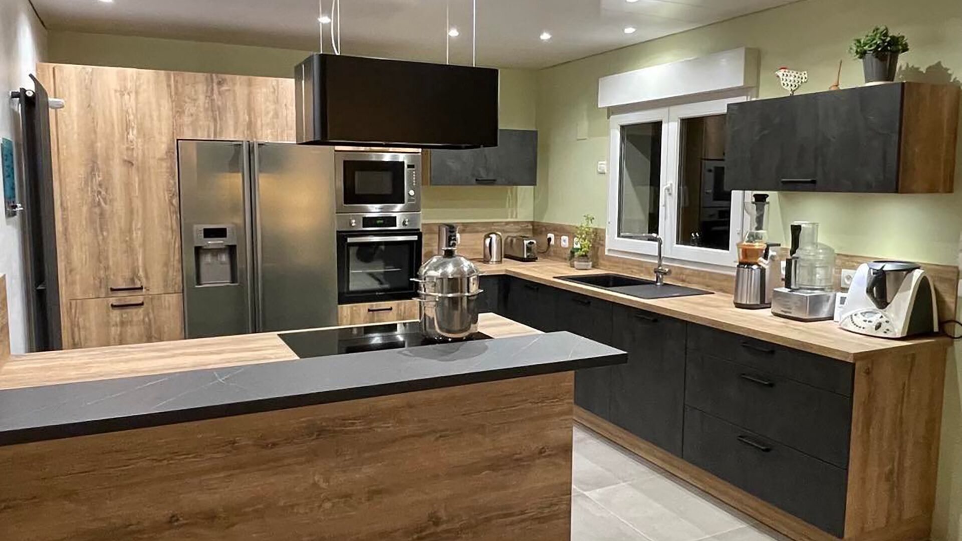 Nadia a décidé de faire de sa cuisine une pièce au caractère bien affirmé. Les travaux de rénovation ont donc remplacé les meubles blancs par des façades à la couleur noire texturée et le plan de travail style granite par un modèle en bois. Le jaune vif des murs laisse également la place à un vert pâle tendance, qui adoucit le design Fusion de l’ameublement par son esprit nature. L’électroménager parfaitement intégré aux meubles est lui aussi très moderne, en accord avec l’îlot central aux deux plans de travail décalés et bi-matières. Une impression haut de gamme se dégage nettement de cette cuisine dont le design a été repensé jusqu’au sol, où de grands carreaux viennent agrandir l’espace.