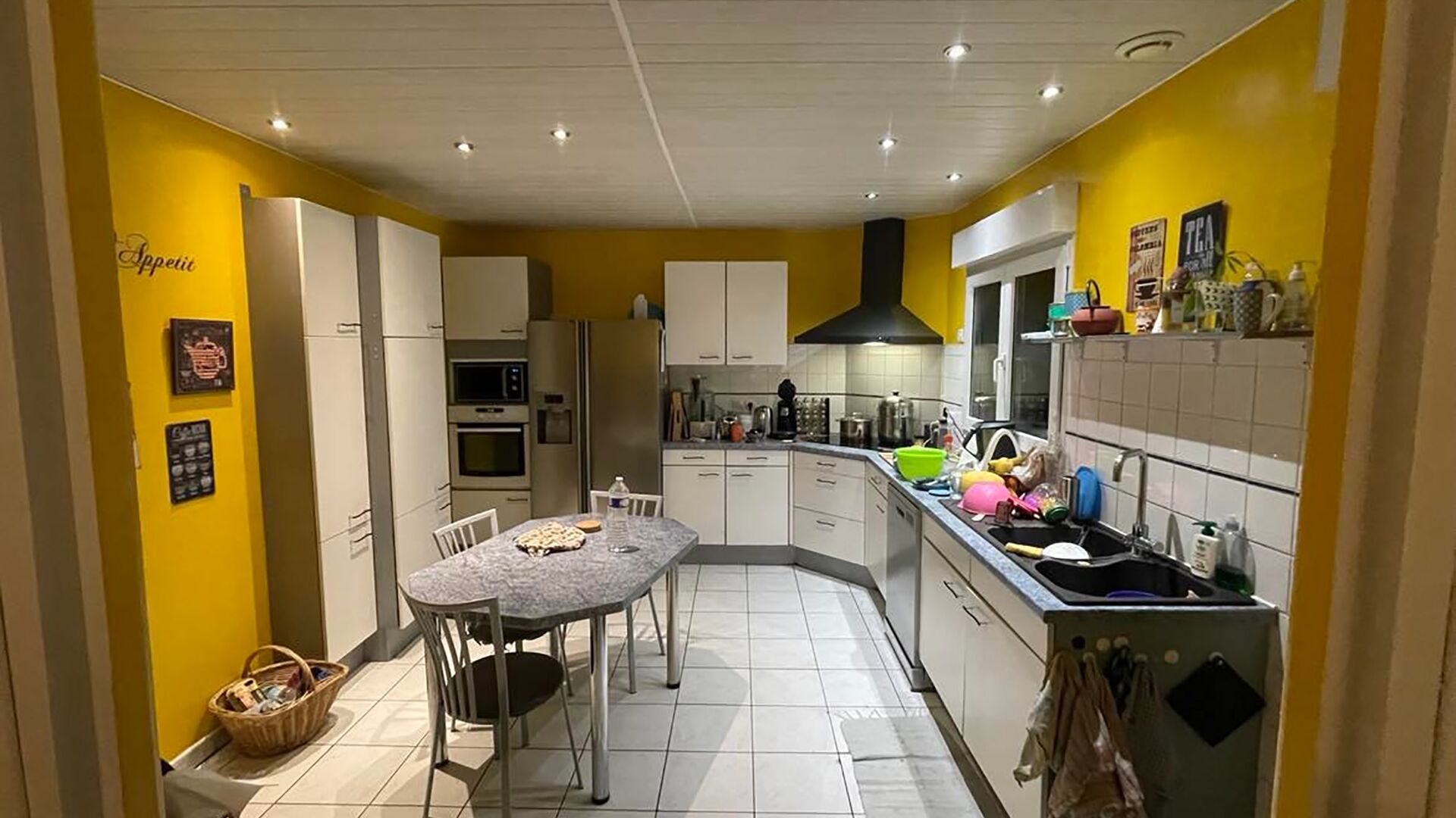 Valérie avait l’une de ces cuisines au charme authentiquement vintage. Les travaux de rénovation ont fait de cette pièce un modèle de modernité, dans un esprit chic et intemporel. Exit le carrelage jaune et place à un plan de travail et une crédence en bois ! Les meubles restent blancs, mais arborent une façade lisse et de longues poignées design, à l’opposé des moulures et des petites poignées rondes qui habillaient l’existant. Les meubles grimpent jusqu’au plafond pour maximiser les rangements tout en donnant une impression de sobriété et mettre fin à l’encombrement visuel donné par les divers objets stockés au-dessus des meubles hauts. La monotonie est rompue par les lignes qui délimitent les meubles dans un esprit graphique très design.
