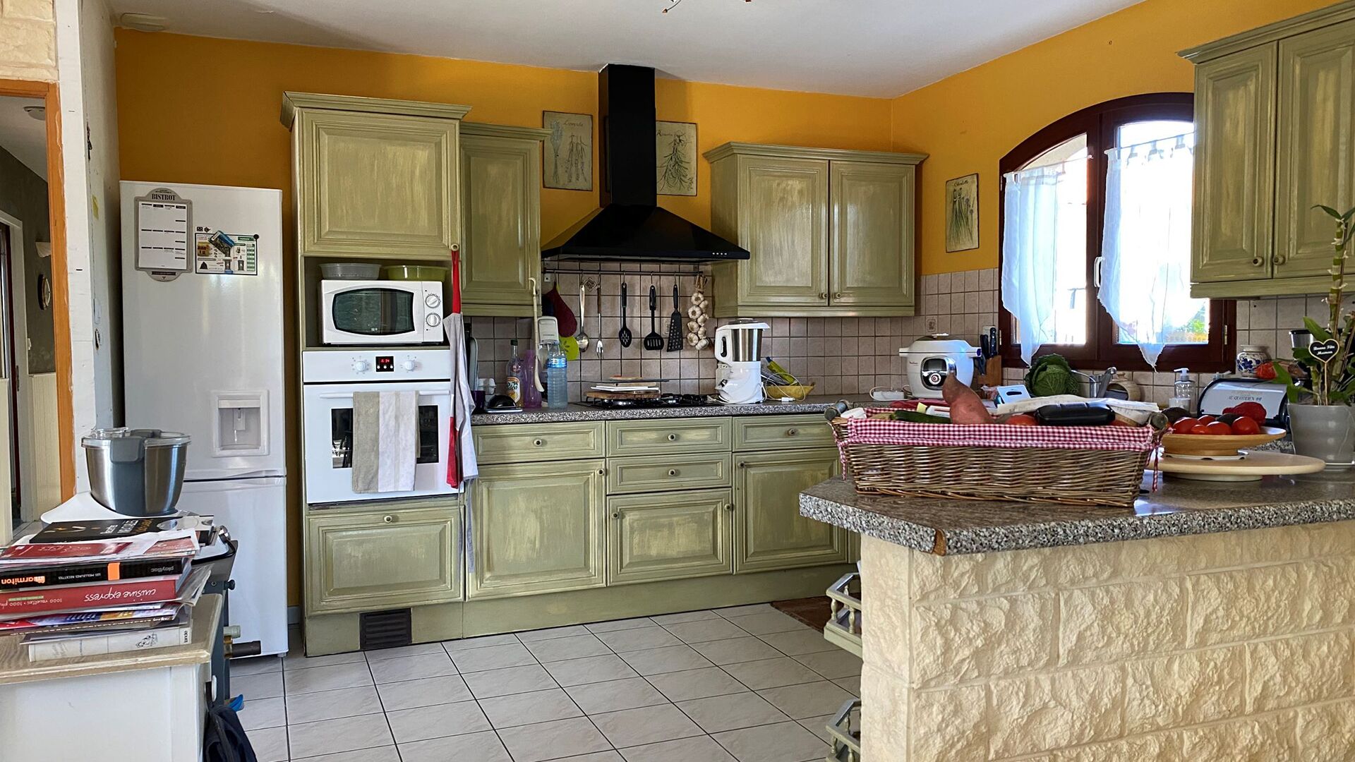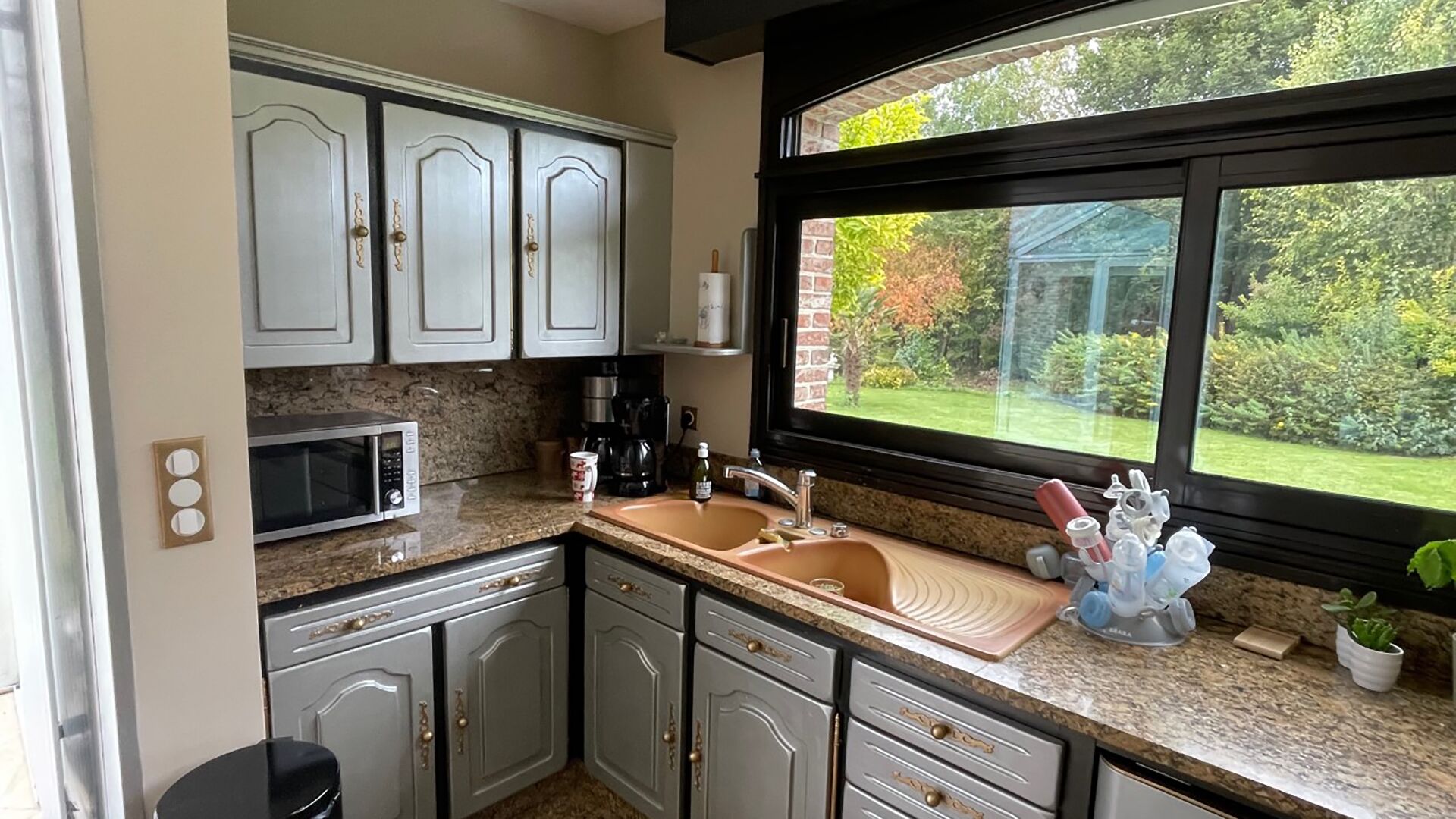 Les travaux de rénovation ont permis à cette cuisine de s’inscrire au cœur des tendances. Avec ses meubles aux façades lisses, son îlot central au plan de travail bi matériaux et sa cave à vin, la pièce a tout des cuisines modernes au design travaillé. La couleur kaki des meubles, associée au bois du plan de travail, de la crédence et des plinthes, apporte en intérieur une note de nature en harmonie avec la vue sur le jardin depuis la fenêtre devant l’évier et la baie vitrée sur le côté. Le choix des poignées de meubles en coquille et des suspensions en métal qui font écho à l’évier et à l’encadrement des fenêtres noirs souligne la modernité de l’ensemble par son design industriel.