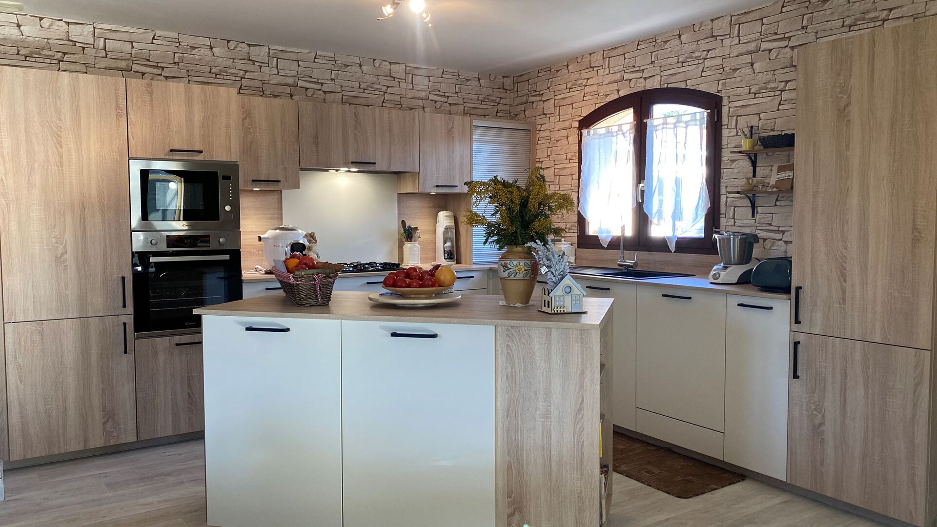Pour la rénovation de sa cuisine, notre client a vu les choses en grand et a fait le choix de changer jusqu’à la disposition des meubles. L’ancienne cuisine en U est devenue une cuisine en L avec un îlot central posé en diagonale. L’idéal pour rendre la pièce, ouverte sur le salon, plus conviviale. L’électroménager a également été remplacé par des modèles plus modernes noir et inox et intégrés aux meubles choisis pour leur caractère fonctionnel : des tiroirs à l’anglaise qui facilitent l’accès au contenu, un placard qui se ferme par un store... Le caractère moderne des façades blanches et en bois rehaussées de poignées noires s’intègre parfaitement au parement en pierre des murs, pour un design soigneusement maîtrisé.