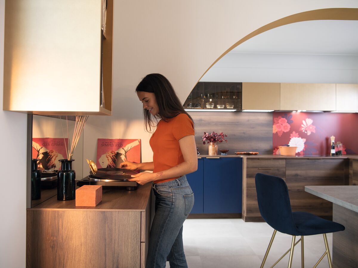 Chez moi, le vintage est mis à l’honneur, la déco des années 70 est actualisée avec les tendances actuelles : bois foncé, lignes arrondies, touches dorées… La part belle est faite à des objets iconiques chinés, des décorations artisanales. Ma platine et mes vinyles ont leur propre meuble de rangement.